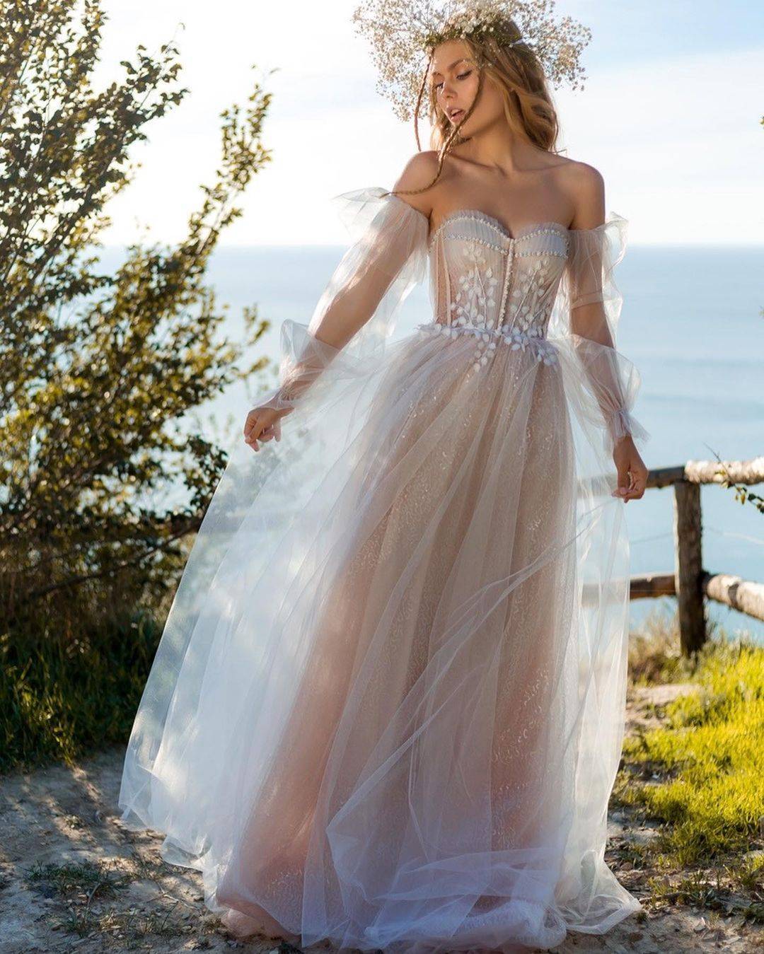 - Природные цвета. В стиле рустик отдается предпочтение не кипельно-белому, а более натуральным оттенкам: светло-бежевому, молочному, пудровому, что демонстрируют свадебные платья на представленных ниже фото.