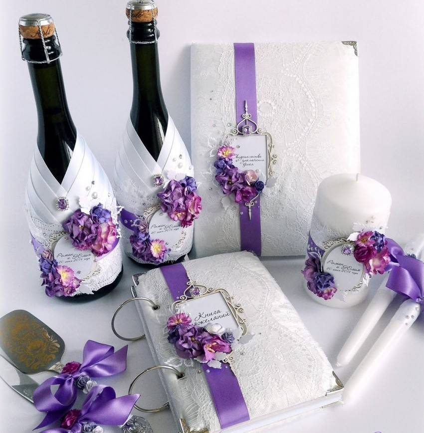 - бутылки шампанского с оригинальным и красивым декором, выполненным при помощи различной свадебной мишуры: лент, бантов, бусин, кружев и прочих элементов;