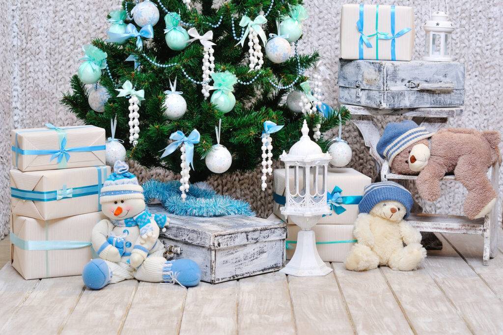Популярный стиль, предполагающий сочетание бело-бирюзовой гаммы. Основные оттенки новогоднего дизайна – белый, молочный. Яркие акценты – голубой. В такой палитре оформите елку, подберите постельное белье, скатерть на праздничный стол.