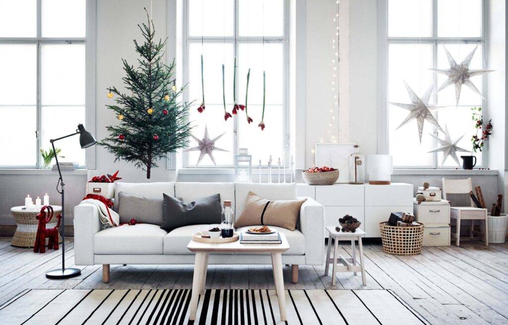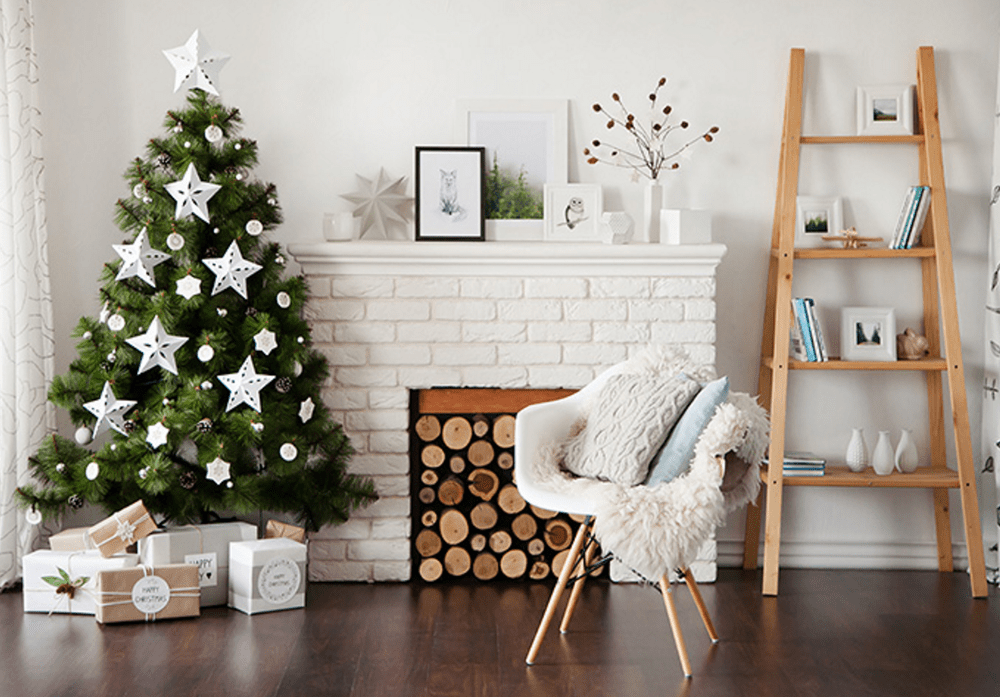 Гостиная – первая комната для фотозоны, которую можно оформить своими руками. Тут чаще всего устанавливают елку, которая будет считаться центром композиции. Поэтому приготовления обычно начинают именно с нее. В минимализме или скандинавском стиле игрушки могут не использоваться. Дерево часто украшают яркой гирляндой с разноцветными лампочками. На фотографиях они могут создавать эффект боке, который смотрится симпатично.