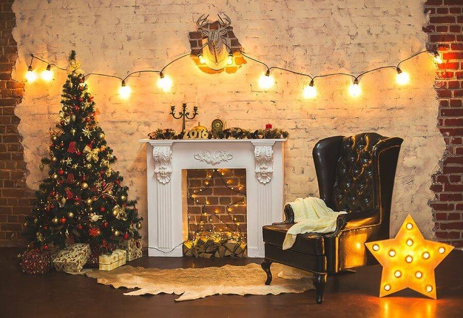 Камин можно декорировать подручными средствами. Необязательно, чтобы он был настоящим, можно взять фальшивый. Эту зону нередко соединяют с елкой, чтобы картинка для фото получилась еще более интересной.