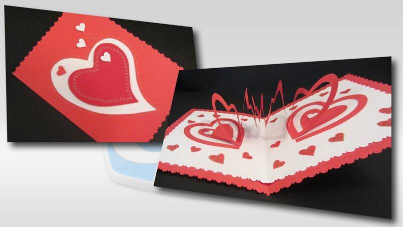 1. Вырежьте из ватмана два сердца. При этом одно сердечко должно быть чуть больше другого по размеру. Также вырежьте две узкие полоски и две полоски пошире, на краях сделайте зубцы.