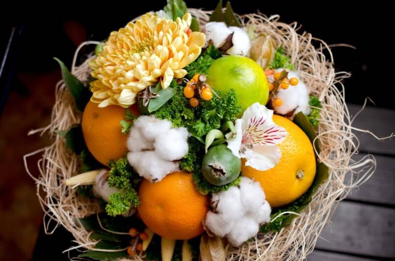 Праздничный стол можно декорировать живыми цветами. Красивую композицию располагают в вазе в центральной части стола. Необычное решение расстановка компактных корзиночек с цветами. Небольшие цветы можно положить у тарелок.