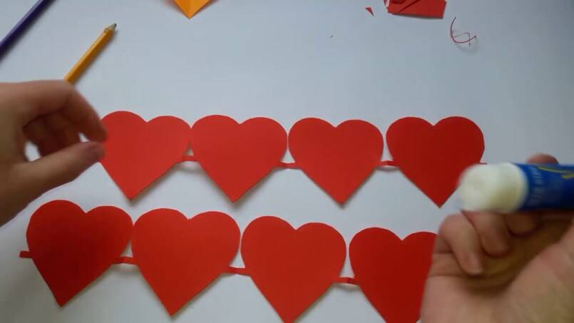 2. По краю большого сердца нанесите клей и приклейте широкую полоску, при этом сгибайте ее по линии сердца. С другой широкой полоской сделайте тоже самое.