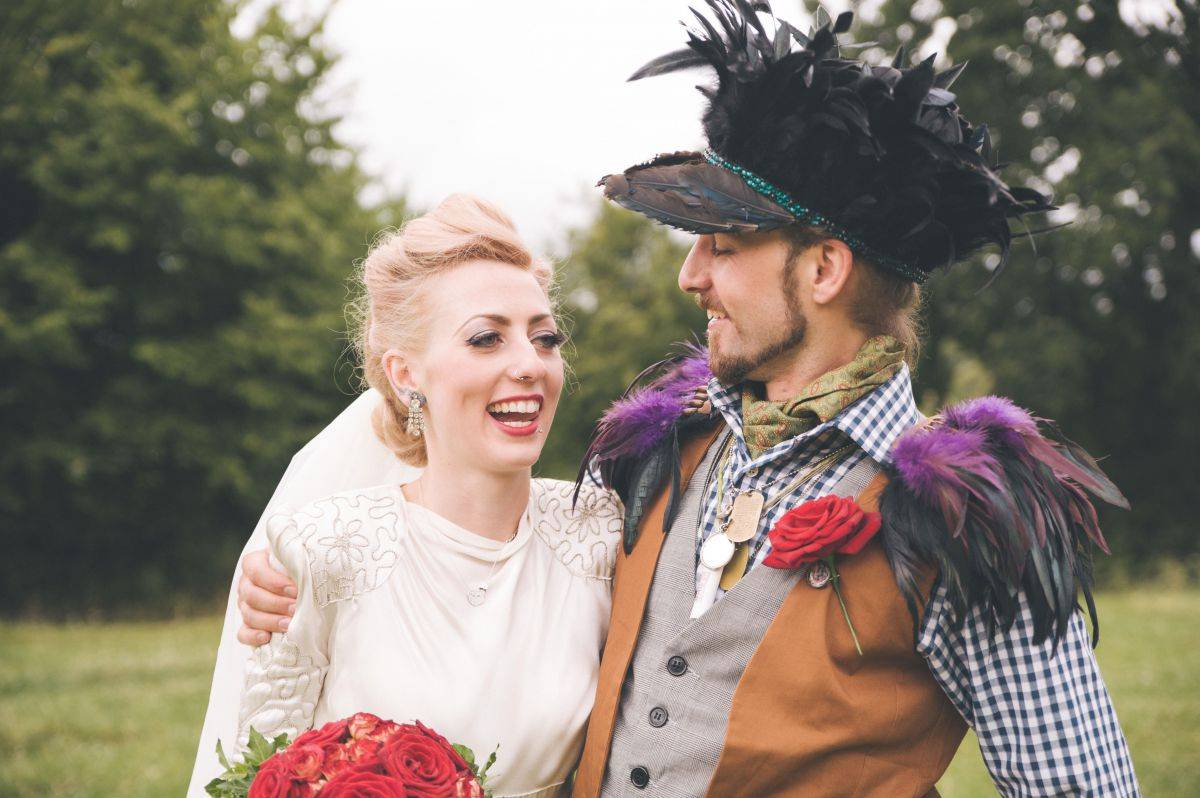 Для наряда невесты идеально подойдет нежное платье с кружевом в викторианском стиле. Его цвет может быть как белым или айвори, так и светло-голубым, совсем как-то платье Алисы из фильма Тима Бертона. Смелые невесты могут остановить свой выбор на коротком платье со шлейфом, состоящим из множества оборок. Традиционную фату можно заменить кокетливым белым цилиндром, изящной шляпкой с вуалью или нежным ободком с лентами и цветами. Для букета невесты идеально подойдет сочетание белых и красных роз.