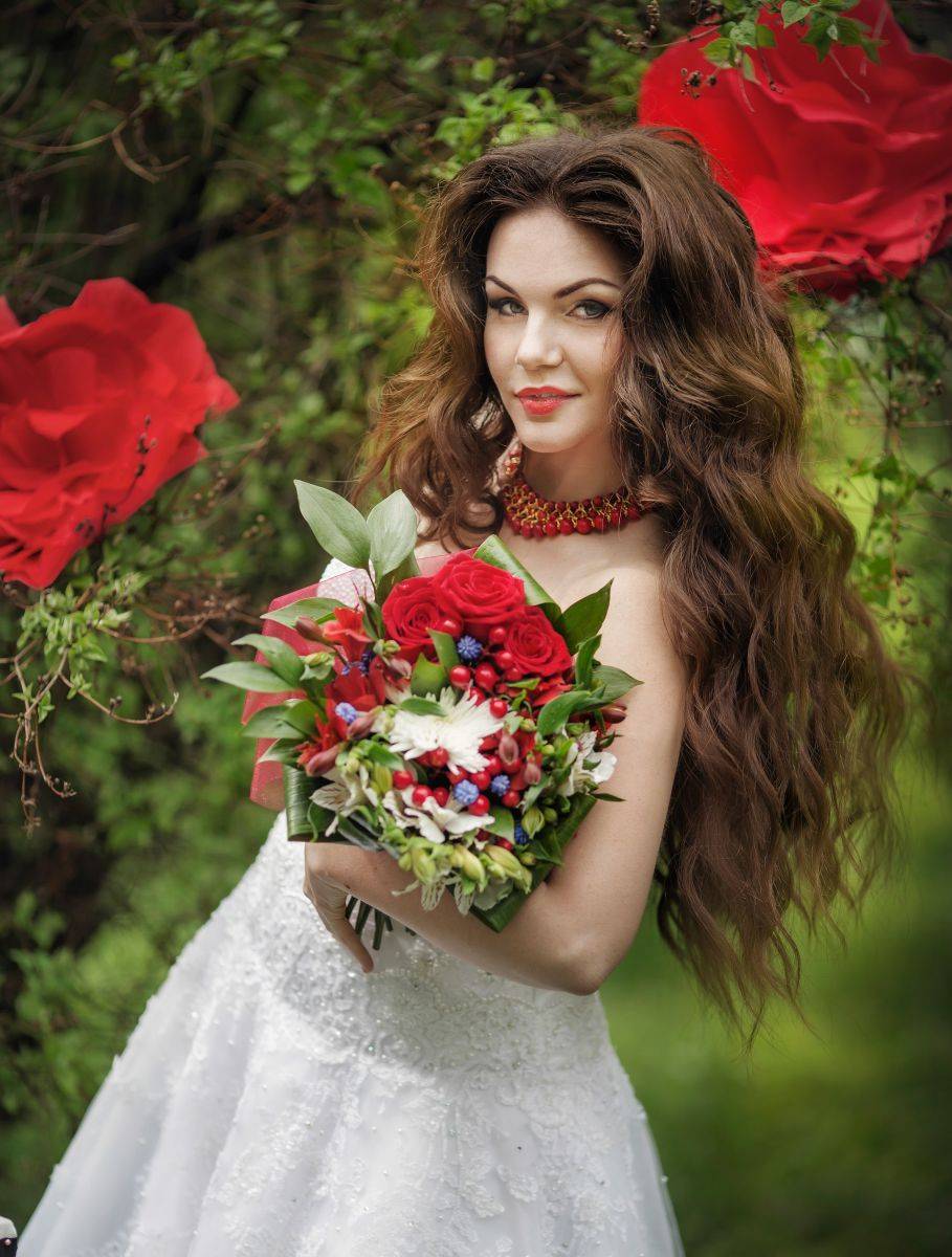 — для невесты в образе русской красавицы отличным решением станет красивый сарафан, а прической – коса;