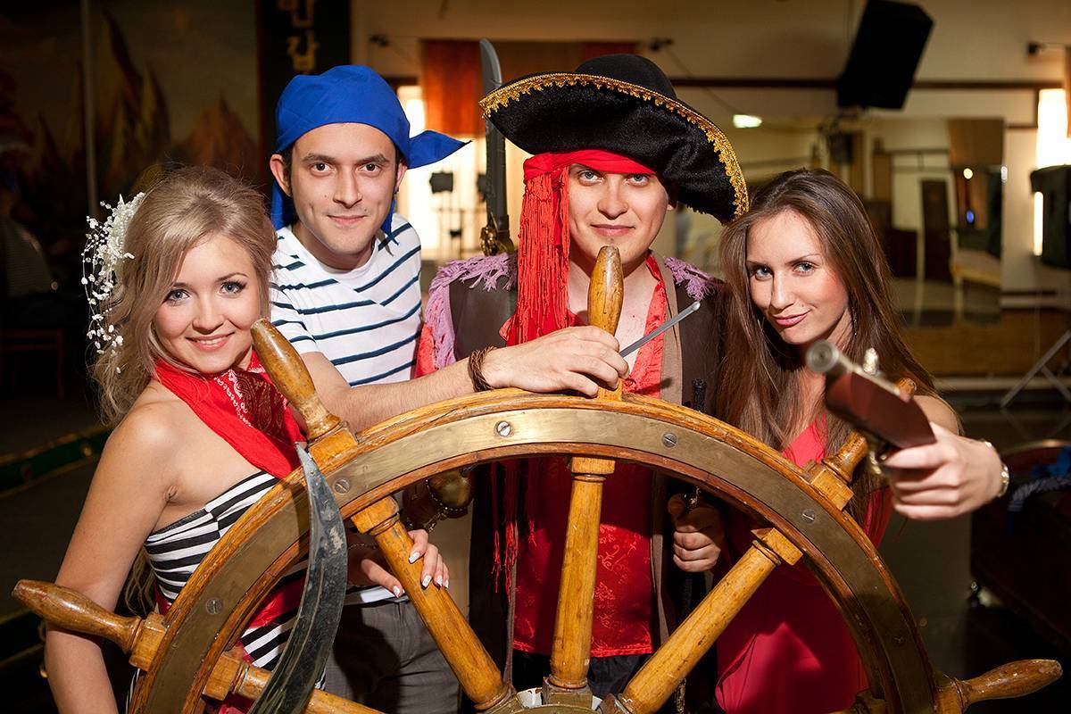 Если же вы хотите пиратскую тематику, то ведущими цветами должны быть белый, красный и чёрный. Без пиратского флага и сундуков с сокровищами, бутылок рома просто никуда. Можно повеселить гостей, поставив тантамареску в виде пиратов из фильма (например, героев «Пиратов Карибского моря») или более шуточных – из мультфильма (например, «Остров сокровищ»).