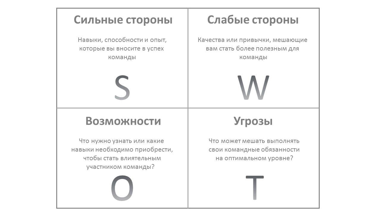 Понимание себя имеет основополагающее значение для работы в команде. Самоанализ может быть сложным процессом, поэтому убедитесь, что вы ищете несколько точек данных, которые помогут вам оценить ваш взнос в командный результат. Для начала вы можете провести SWOT-анализ себя как члена коллектива. SWOT означает сильные и слабые стороны, возможности и угрозы. Постарайтесь выделить немного времени и подумать о каждой категории данного анализа.